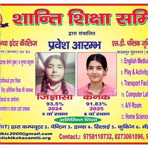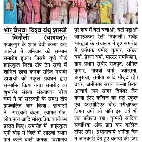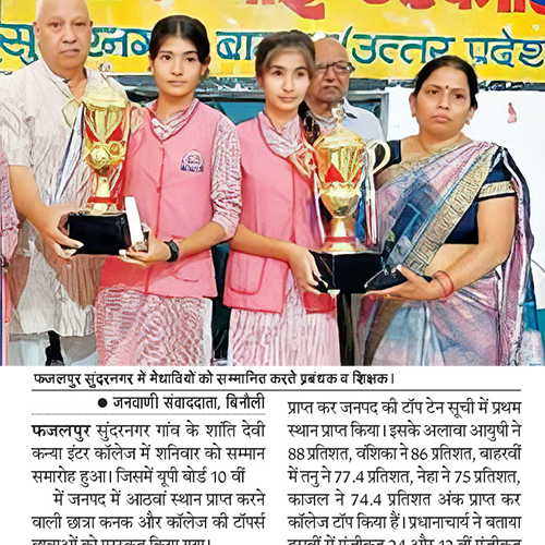 An award ceremony was held on Saturday at Shanti Devi Kanya Inter College in Fazalpur. In which brilliant students including Kanak, who was included in the UP Board High School District Top Ten list, were honored by the school management.